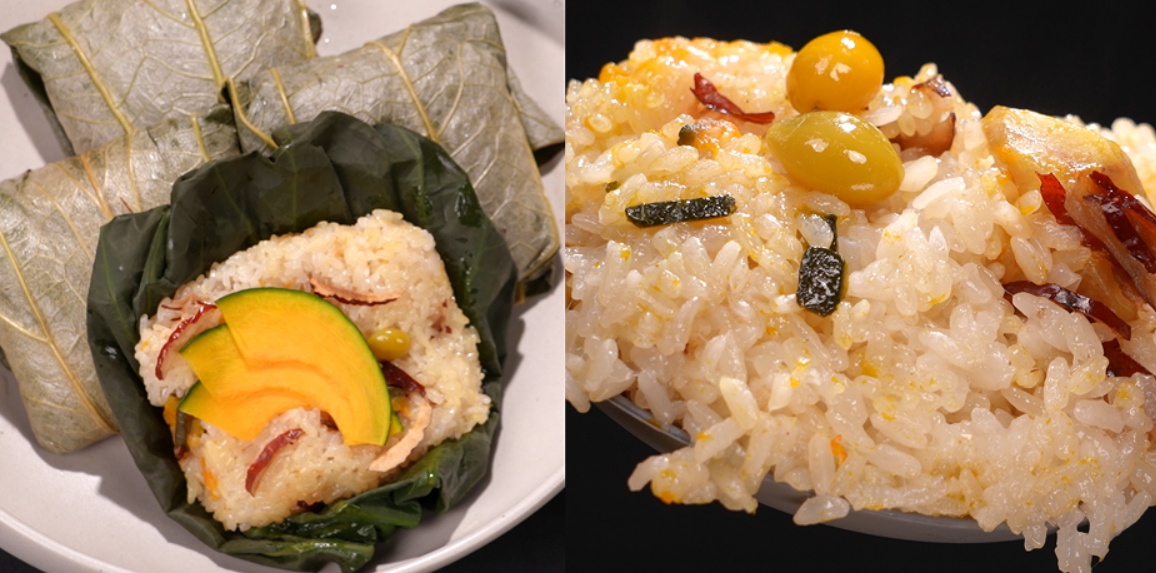 - 연잎에 밥 한 주걱을 올리고 그 위에 대추, 밤, 은행, 단호박을 고명으로 올린 후, 연잎의 위, 아래, 양옆을 접는다.